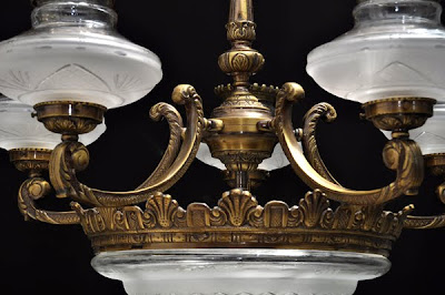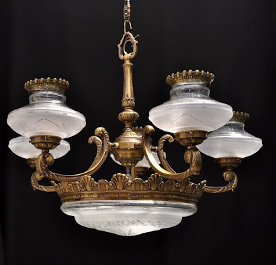 Lámpara de bronce de 5 brazos y 6 luces , lleva plafón de cristal central y 5 brazos con tulipas coronadas en bronce.