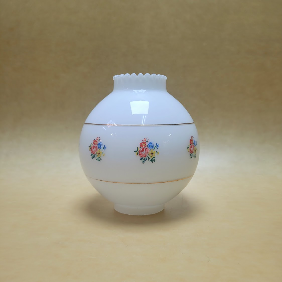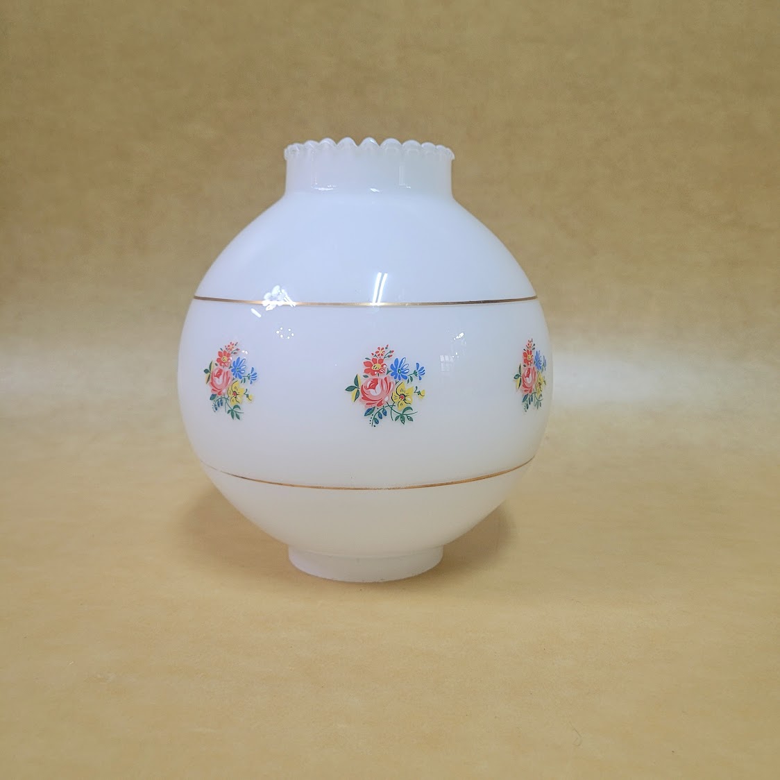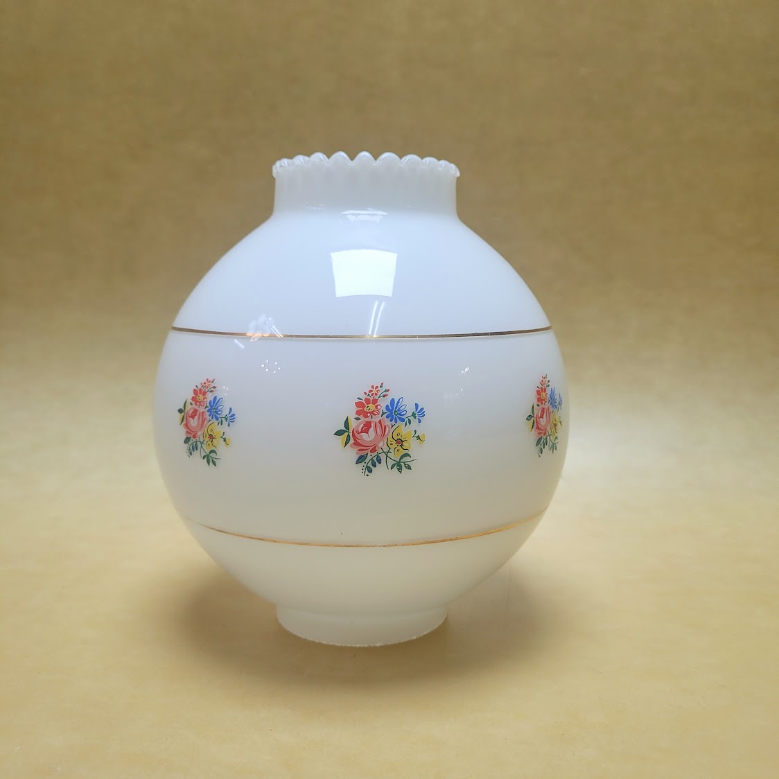 Tulipa bola de 2 bocas antigua en opal con estampación floral acotada por filo dorado con alguna imperfección por el paso del tiempo.